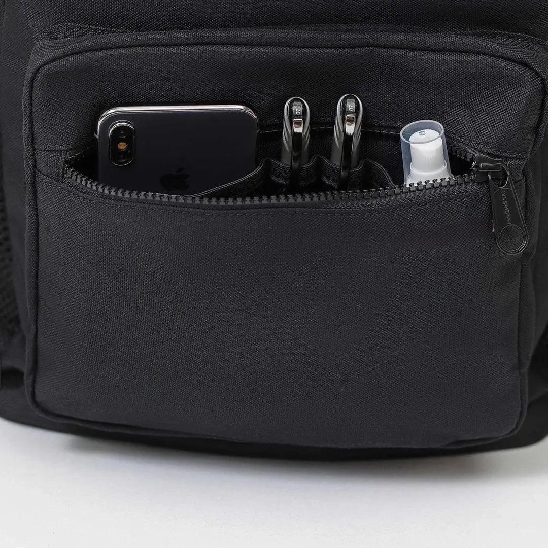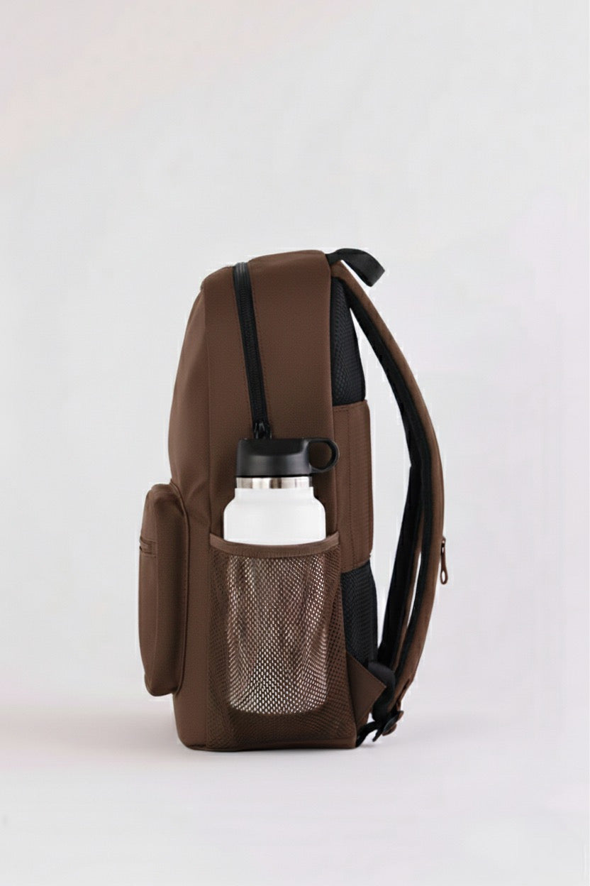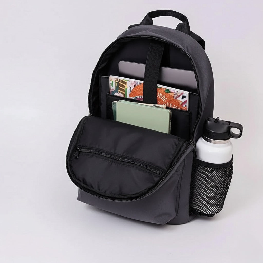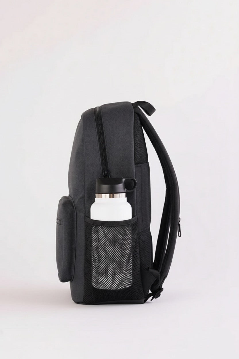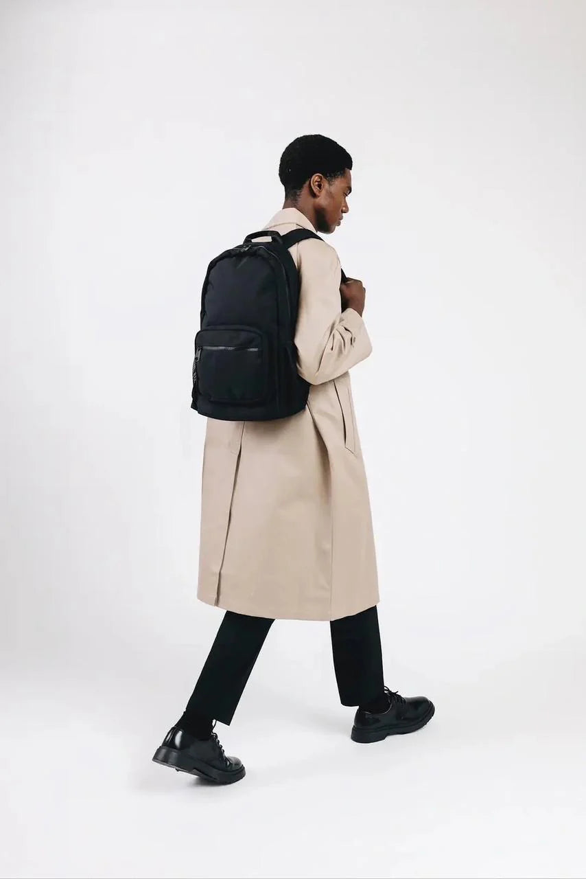 The Overtop Classic is the ultimate backpack for those who need versatility and style. whether you're heading to work, traveling, or hitting the gym, this backpack adapts to your lifestyle. crafted with high-quality materials and a sleek design, it's a timeless addition to any wardrobe. with water-resistant fabric, your essentials stay protected, while the YKK zippers ensure durability and security. the classic has multiple compartments, including a laptop sleeve, tablet sleeve, and a removable drawstring bag for gym clothes or shoes. it also features two stretchable water bottle holders, a luggage sleeve, and 10 additional pockets to keep you organized. the adjustable padded shoulder straps and padded back ensure all-day comfort, while the mesh interior pocket and vegan leather trim add a touch of luxury. designed for practicality and style, the classic is your go-to companion for any occasion. plus, its sustainable approach means you can carry with confidence, knowing you've made an eco-friendly choice. discover the backpack that does it all — your new favorite, the classic.